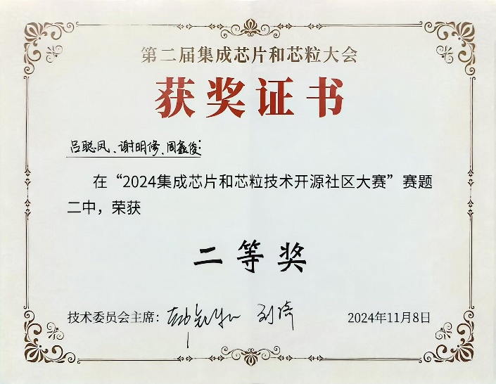 11月8日-10日,由中国科学院计算技术研究所与复旦大学主办的第二届集成芯片和芯粒大会在北京成功举办。我院葛芬、周芳老师指导的研究生吕聪凤、谢明修、周鑫俊参加了大会组织的集成芯片和芯粒技术开源社区大赛,并获得了二等奖。