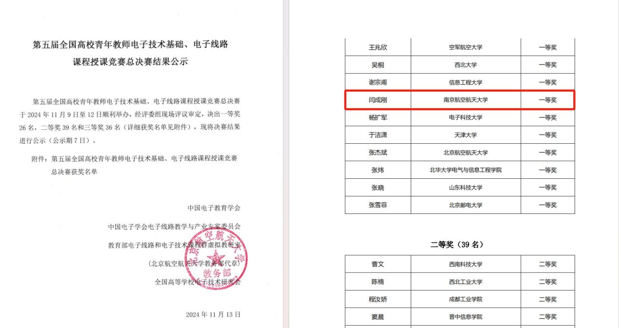 在刚刚结束的第五届全国高等学校青年教师电子技术基础、电子线路课程授课竞赛总决赛中,我院闫成刚老师主讲的《电子线路》课程获总决赛一等奖!