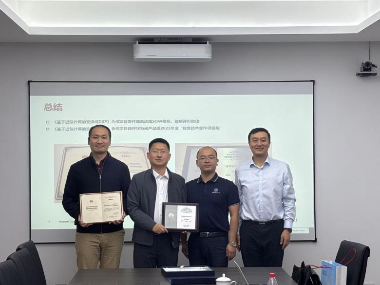 近日,我院刘伟强教授团队荣获华为光产品线2023年度优秀技术合作项目奖。华为公司光产品线研究部光算法技术Lab主任于鸿晨、华为南京研究院高校系统部部长王振飞一行莅临集成电路学院为获奖团队颁奖,以表彰双方在技术合作项目中的卓越贡献和显著成果。