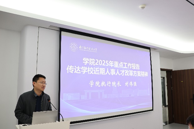 执行院长刘伟强作学院2025年重点工作报告,深入剖析了学院面临的形势与机遇、问题与挑战,围绕高质量党建引领、高水平学科建设、高水平师资队伍建设、创新人才培养体系构建、特色科研团队凝练、高层次国际合作交流等方面,系统谋划了全年重点工作。随后,刘伟强传达学校2025年人事人才工作交流研讨会精神,围绕职称评审改革、绩效薪酬分配改革、准长聘改革、管理队伍建设改革和人才引培制度改革五个方面,详细解读了人事人才重点改革举措。他强调,全体教职工要认真落实学校干部教师大会精神,紧扣全面深化改革主线,进一步统一思想、凝聚共识、汇集力量,为建设空天特色的一流集成电路学院努力奋斗。