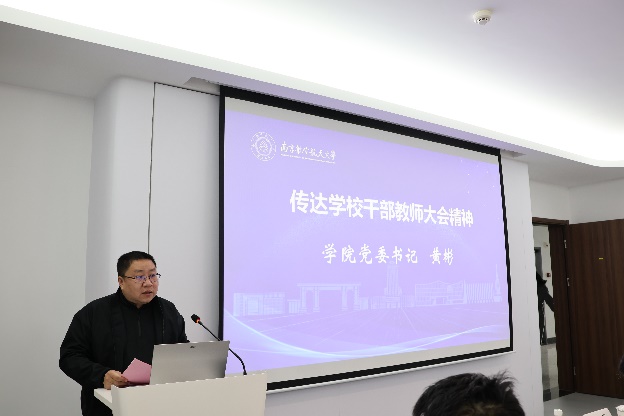 黄彬首先传达学校干部教师大会精神,领学了校长姜斌作的题为《锚定目标 奋发作为 以改革创新推动学校高质量发展》的报告和校党委书记甄良的重要讲话,对甄良书记提到的“八个认清”进行了重点解读。他强调,2025年是“十四五”规划的收官之年,也是将全面深化改革推向纵深的关键之年。学校明确了到2035年进入世界一流大学行列、1-2个学科进入世界一流学科前列、若干学科进入世界一流学科行列的发展目标,擘画了接下来十年的行动蓝图。面对新形势、新任务,学院要坚决贯彻校党委决策部署,锚定学校“2035发展目标”,科学制定学院“十年行动计划”,认真落实“三年改革方案”,不断完善学院治理体系,集聚人心、集势成力,全面推动学院高质量快速发展。
