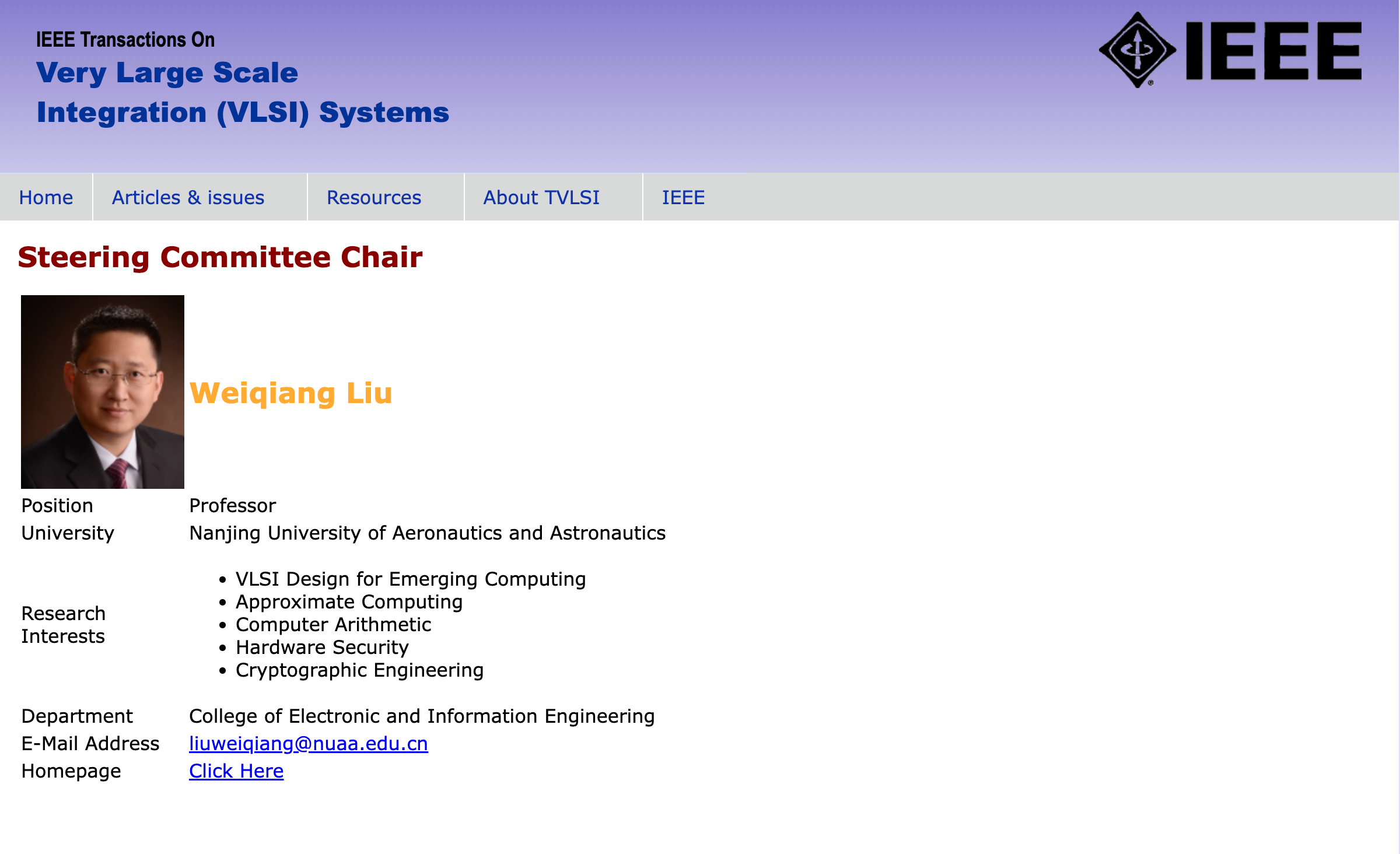 近日,IEEE Computer Society任命我院刘伟强教授为最新一届IEEE Transactions on Very Large Scale Integration System (TVLSI)期刊指导委员会主席(Steering Committee Chair),首期任期为2023.1-2024.12。本届指导委员会共有五名委员,其他四位委员包括:美国斯蒂文斯理工学院的Bryan Ackland教授(IEEE Fellow、ISSCC执行委员会委员、DAC 2002主席)、法国里昂中央理工学院Alberto Bosio教授(欧洲测试技术委员会ETTTC主席)、意大利卡拉布里亚大学Pasquale Corsonello教授(TVLSI前副主编AEiC)、埃及开罗美国大学Yehea Ismai教授(IEEE Fellow、TVLSI前主编)。TVLSI指导委员会负责遴选期刊主编、监督财务及运行情况等重要事项。指导委员会主席负责TVLSI期刊指导委员会的运行和总体协调等。