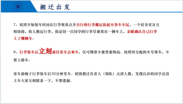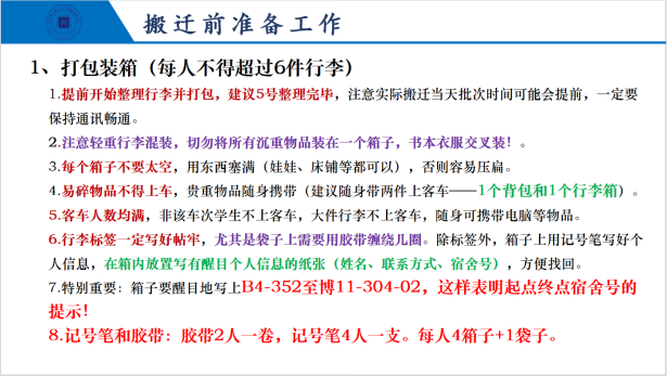 搬迁工作启动前,学院成立了由党政领导班子牵头的专项工作组,多次召开协调会议,细化搬迁方案,制定应急预案。院领导带队深入学生宿舍调研需求,与后勤保障部、天目湖校区管委会等部门建立协同机制,确保“行李打包-运输调度-入住安置”全流程无缝衔接,学院还细化梳理了学生应知的搬迁注意事项,确保逐一提醒到每一位学生,大大提升了工作效率,同时号召行李迁出宿舍整洁如新,让每一间宿舍都能以崭新的面貌迎接新的故事。