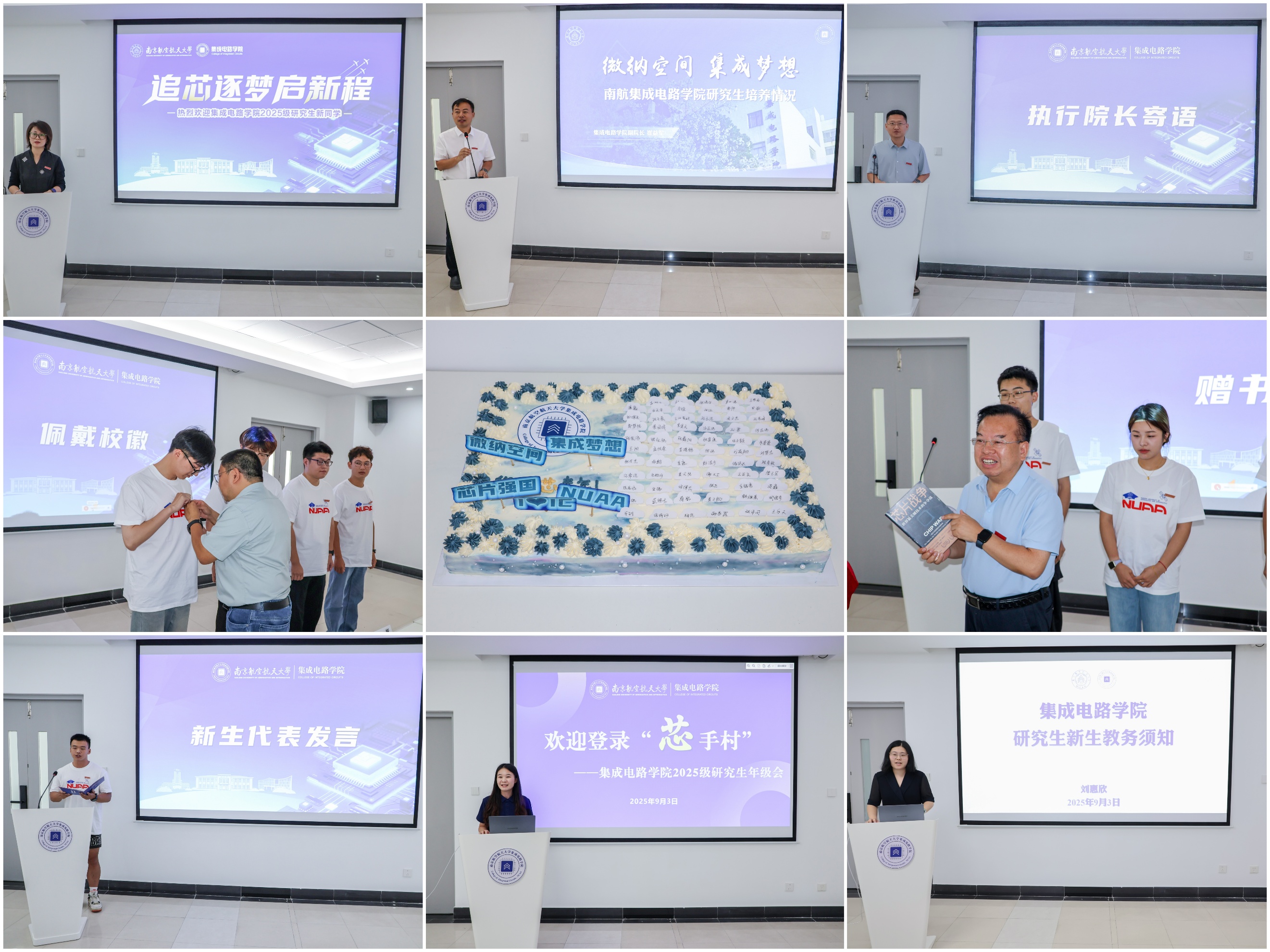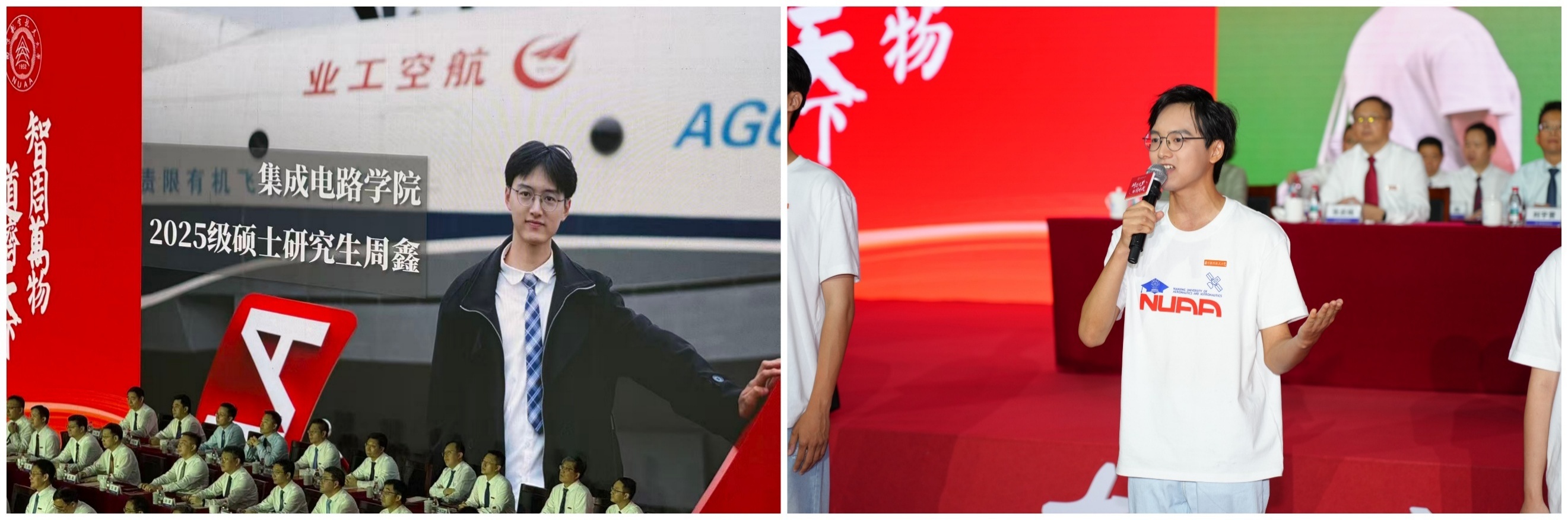 在学校2025级新生开学典礼上,我院研究生学生代表周鑫上台发言,展现集成电路学子的思考与风采。张正、王子杰同学作为新生代表上台佩戴校徽,新一代南航“芯”青年正式启航。