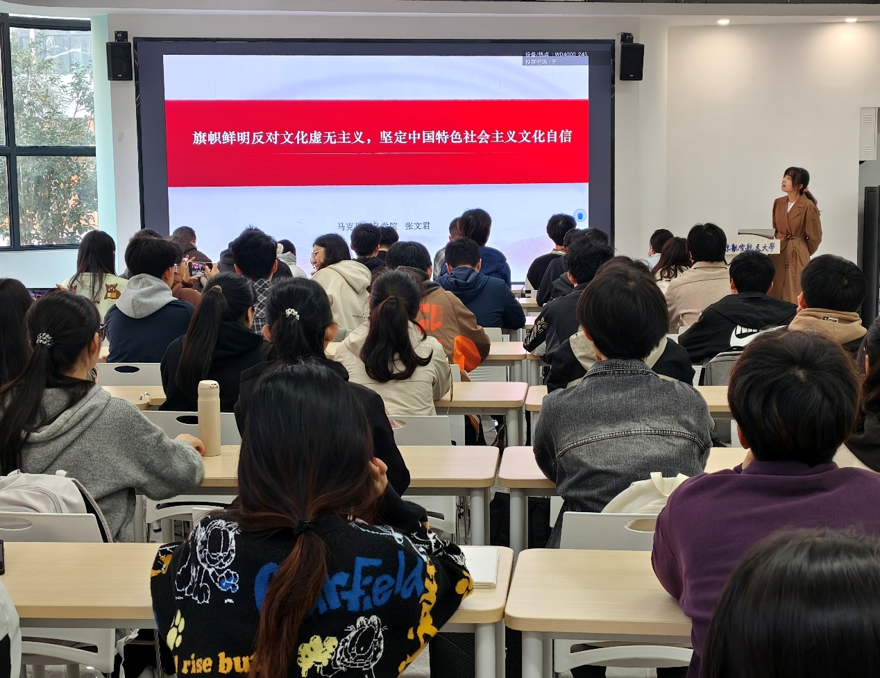 集成电路学院思政专员、马克思主义学院张文君老师讲授《旗帜鲜明反对文化虚无主义,坚定中国特色社会主义文化自信》专题党课。她从“文化虚无主义”的叙事方法出发,结合现实生活中的生动案例,深入剖析了文化虚无主义的现实表现与深层危害,明确指出其错误本质与消极影响,引导同学们要增强防范意识与辨别能力,自觉抵制文化虚无主义,牢固树立中国特色社会主义文化自信。
