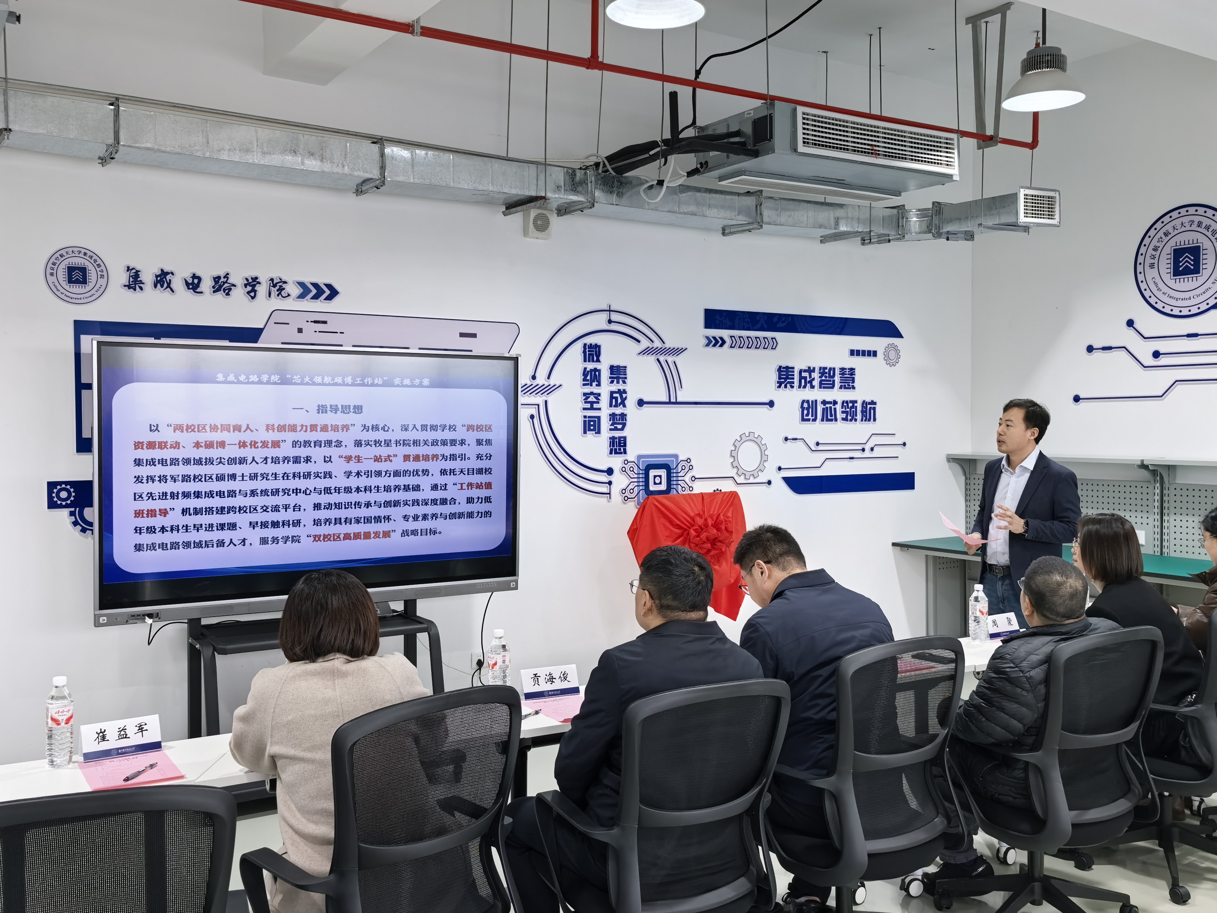 2025年12月16日,集成电路学院在天目湖校区明慧楼C座704成功举办“芯火领航硕博工作站”揭牌仪式暨首次学术交流活动。天目湖校区党委书记、管委会主任缪长宗,牧星学院党委书记贡海俊,集成电路学院党委书记黄彬,牧星学院党委副书记、致微书院执行院长文杰,集成电路学院党委副书记周聚,集成电路学院副院长、致微书院副院长崔益军及师生代表参加。活动由崔益军主持。